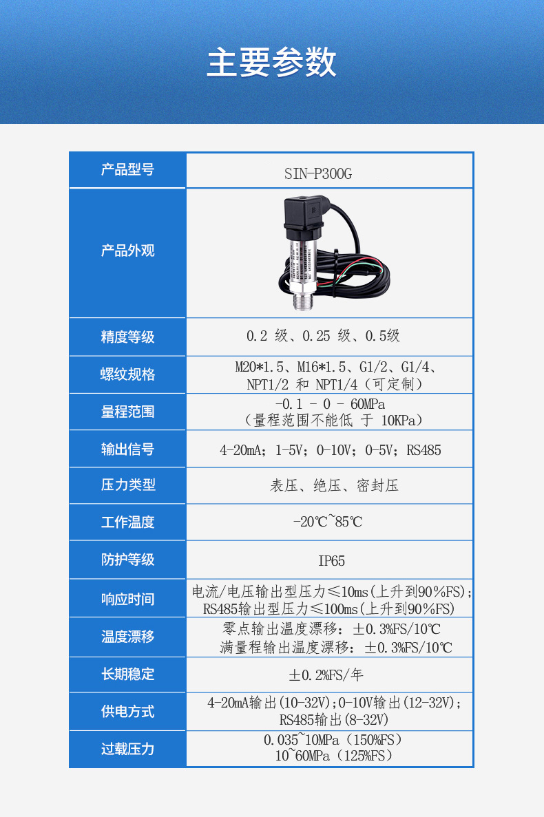 SIN-P300G壓力變送器壓力敏感核心采用了高性能的硅壓阻式壓力充油芯體,內部的專用集成電路將傳感器毫伏信號轉換成標準電壓、電流或頻率信號,可以直接與計算機接口卡、控制儀表、智能儀表或PLC等方便相連。運距離傳輸可以采用電流輸出方式。具有體積小、重量輕、全不銹鋼密封結構,可在腐蝕性環境中工作。